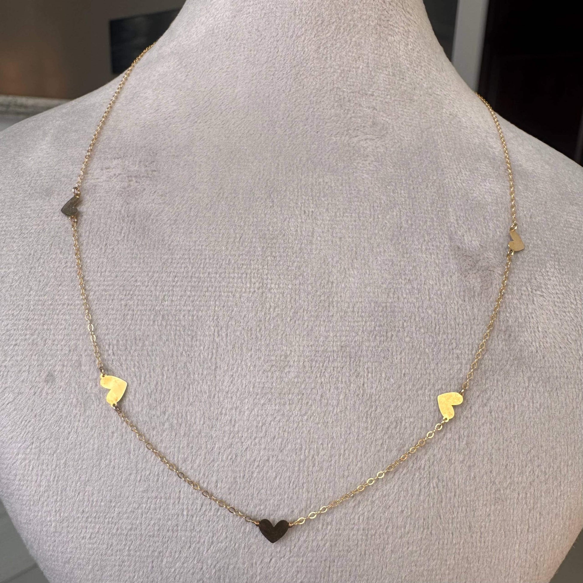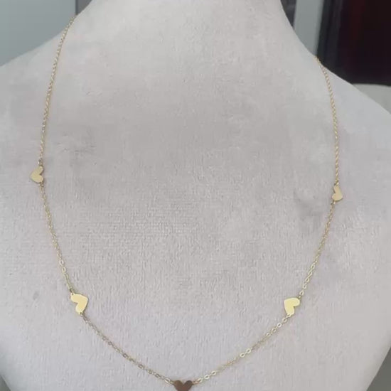 The necklace that carries a sweet promise. Tiny hearts in warm 18K yellow gold are delicately placed along a fine chain, creating gentle movement and soft sparkle as they catch the light with every turn.