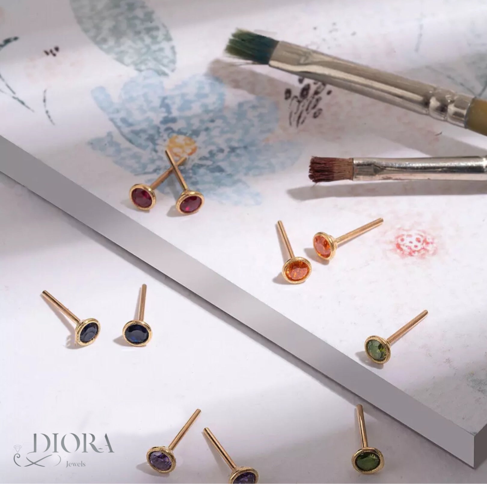 Add a touch of elegance with our Vivid Gem Stud Earrings. Featuring vibrant gemstones in red, green, orange, blue, and purple, set in a delicate gold frame. These earrings offer comfort and style for any occasion. Discover the beauty of DIORA Jewels.