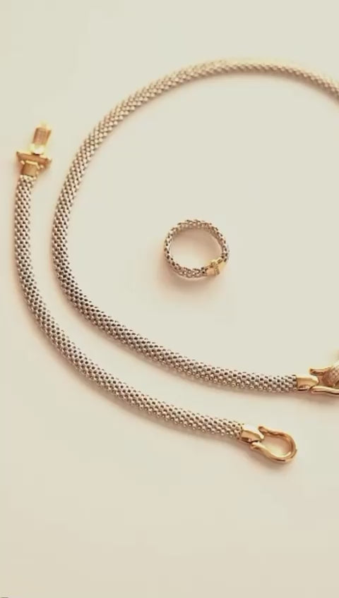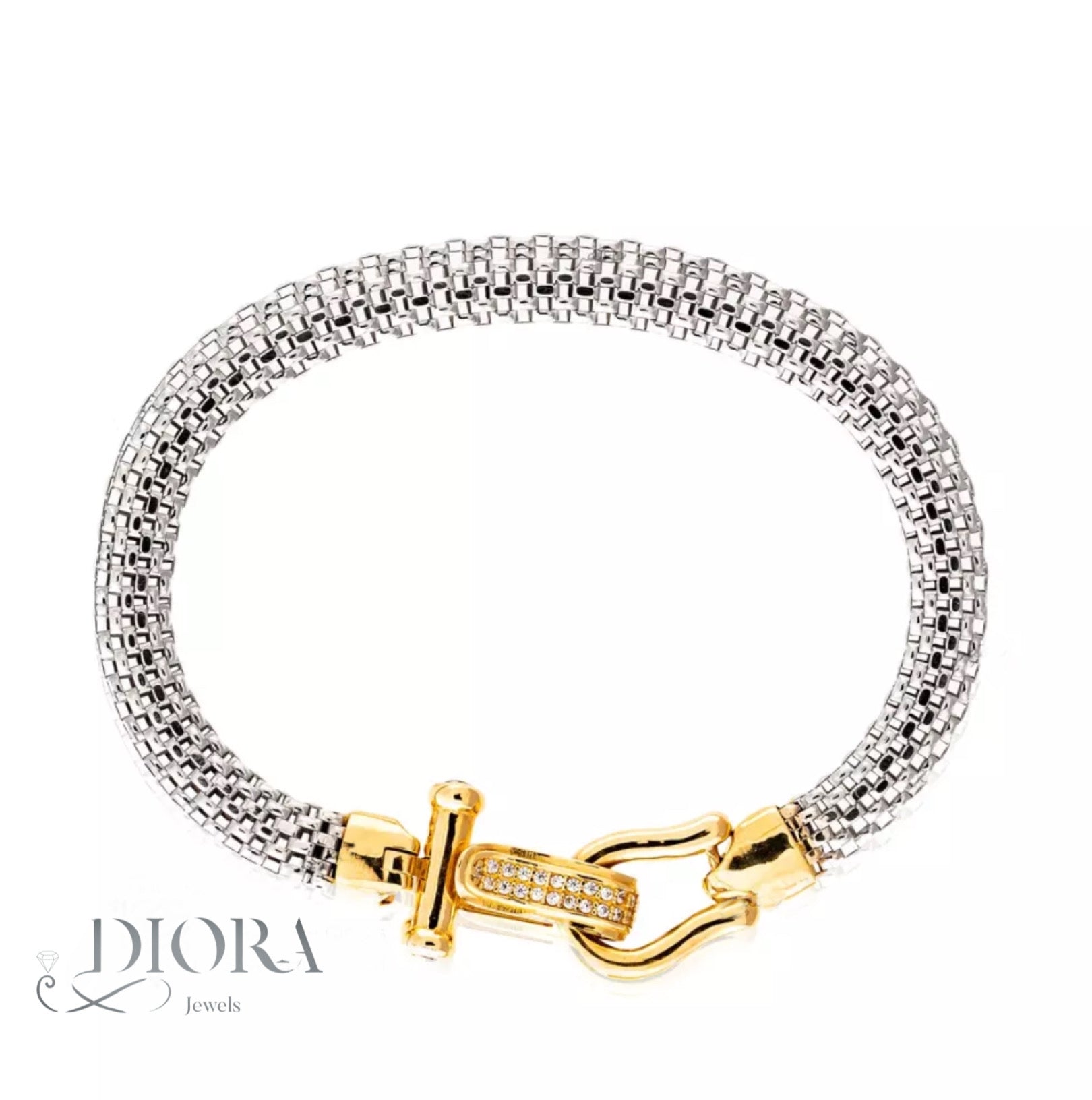 Add a touch of sophistication to your wrist with this stunning bracelet, featuring an intricate mesh design and a luxurious gold clasp adorned with sparkling stones.
